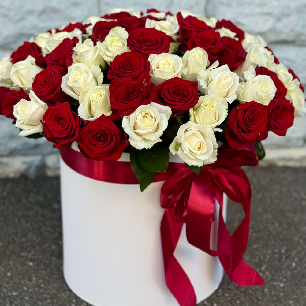 101 троянда у шляпній коробці – це розкішна та елегантна композиція з білих і червоних троянд. Червоні троянди символізують пристрасть і кохання, а білі – чистоту та щирість почуттів. Такий букет створює ефект справжнього свята та стане незабутнім подарунком для ювілею, освідчення або романтичного жесту.