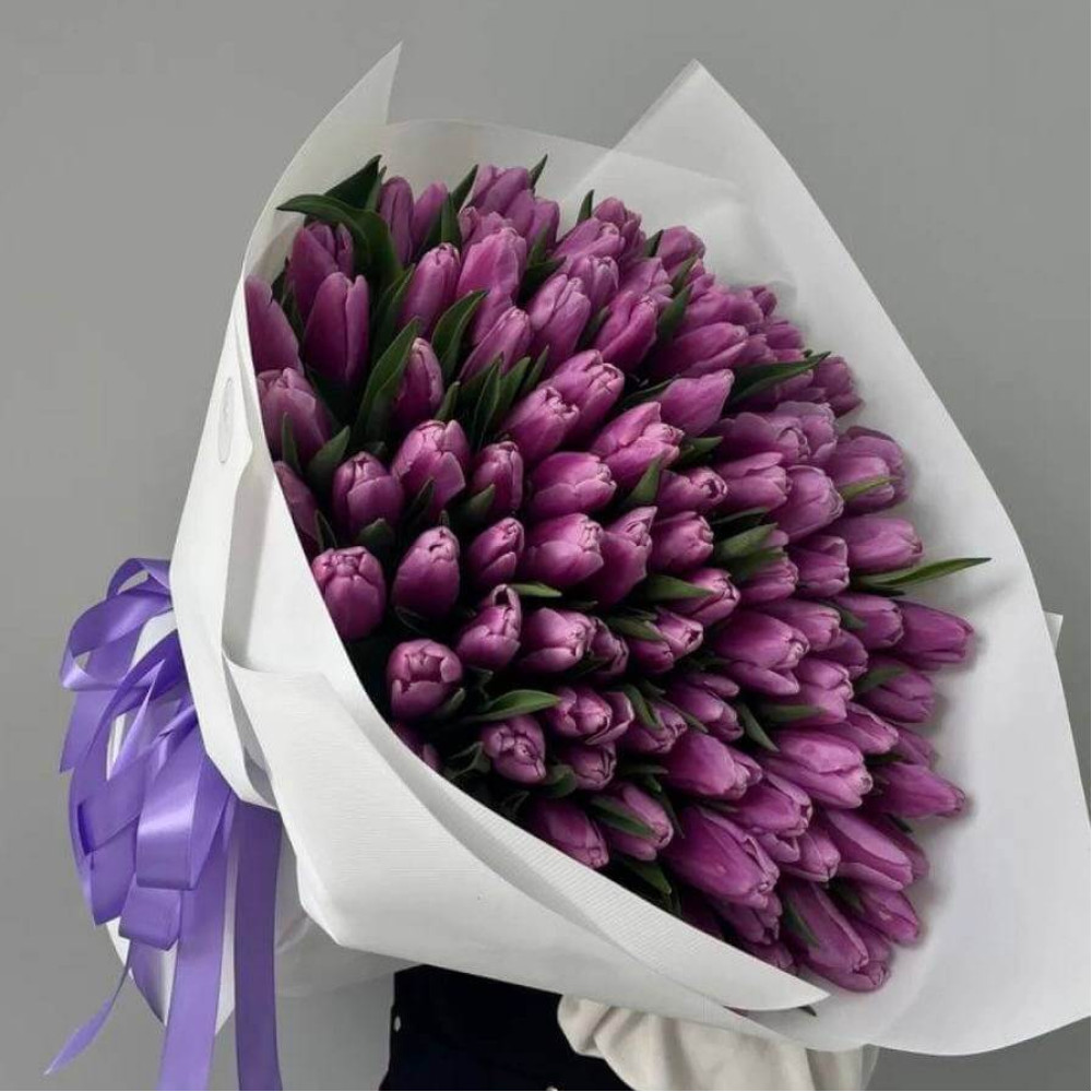 101 фіолетовий тюльпан — це вишуканий та ефектний букет, який привертає увагу глибоким насиченим кольором. Фіолетові тюльпани символізують благородство, повагу та особливе ставлення, тому така композиція виглядає статусно й незвично.