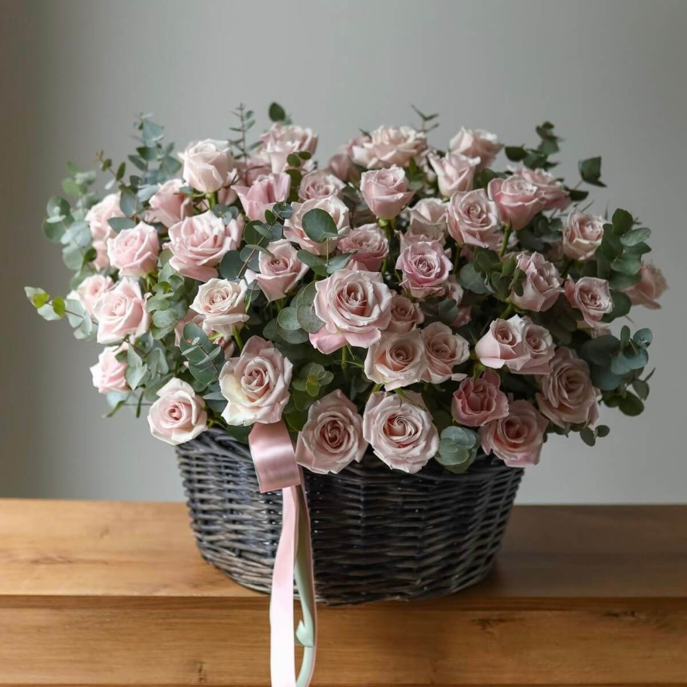 ✨ Купити кошик із 101 трояндою Кімберлі та евкаліптом Київ – це розкішний подарунок, який запам’ятається назавжди.
