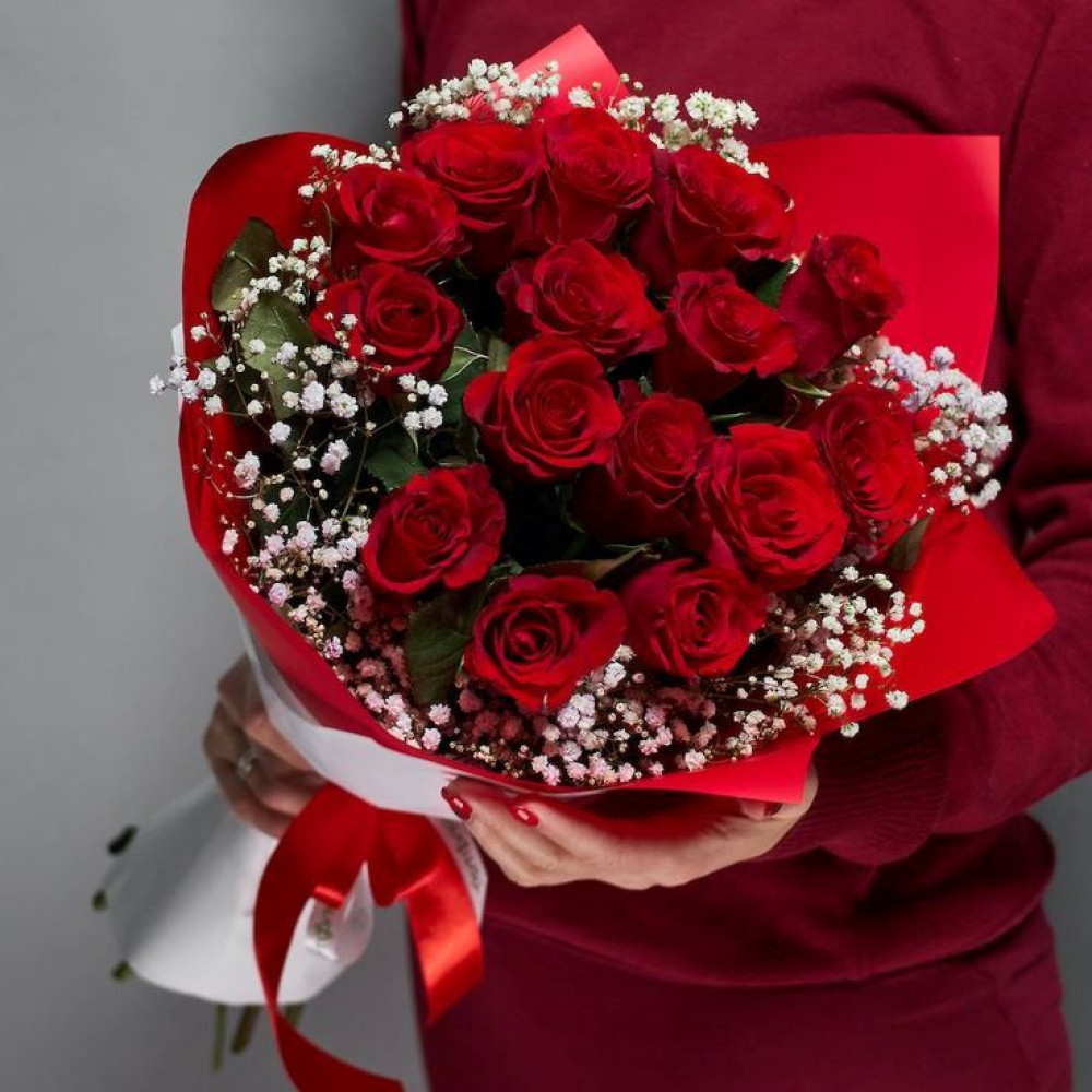 Композиція з 15 свіжих червоних троянд, доповнених гіпсофілою, стане ідеальним подарунком для освідчення в коханні, річниці, дня народження або романтичного сюрпризу. Поєднання класичних троянд і ніжних дрібних квітів створює гармонійний та святковий образ.