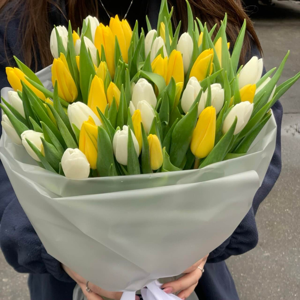 15 або 25 білих та жовтих тюльпанів — це легкий, світлий букет, який дарує гарний настрій і теплі емоції.