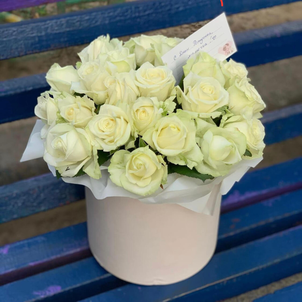 25 білих троянд у шляпній коробці – це ніжна та витончена композиція, що символізує чистоту, щирість та елегантність. Ідеальний подарунок для романтичного жесту, ювілею або важливої події, коли важливо показати свої почуття.
