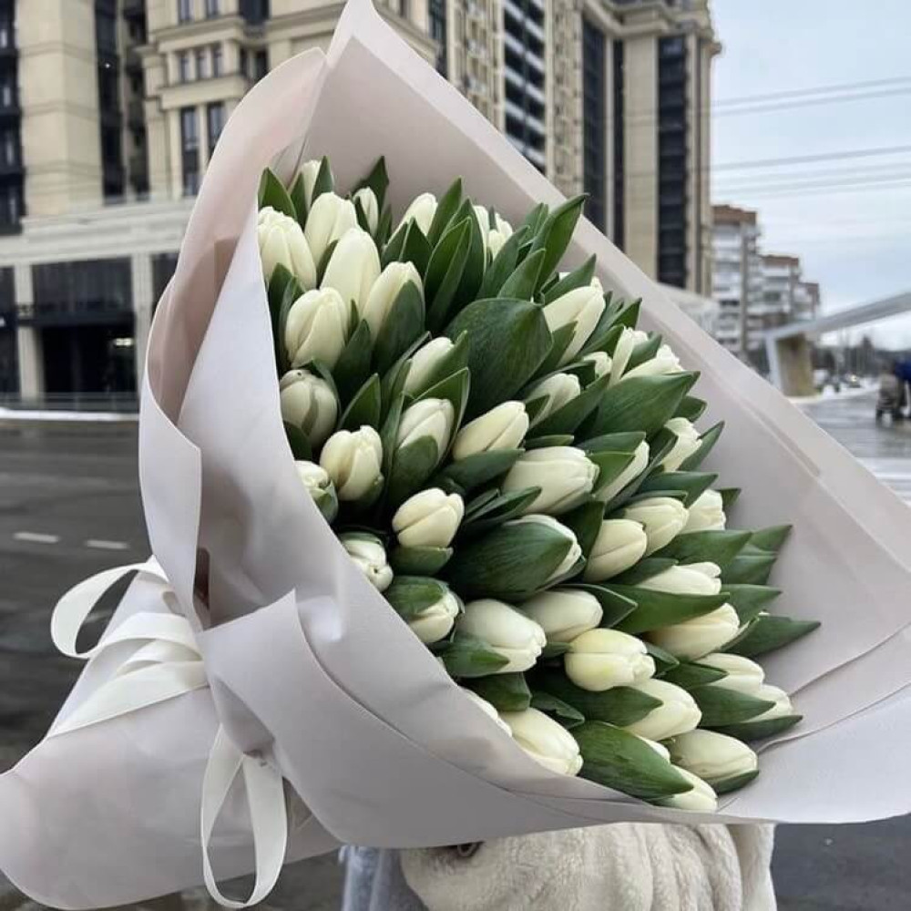 51 білий тюльпан — це вражаючий букет, що символізує чистоту почуттів, повагу та гармонію. Велика кількість білих тюльпанів створює ефект розкоші й водночас зберігає стриману елегантність, роблячи композицію доречною для особливих подій і важливих моментів.
