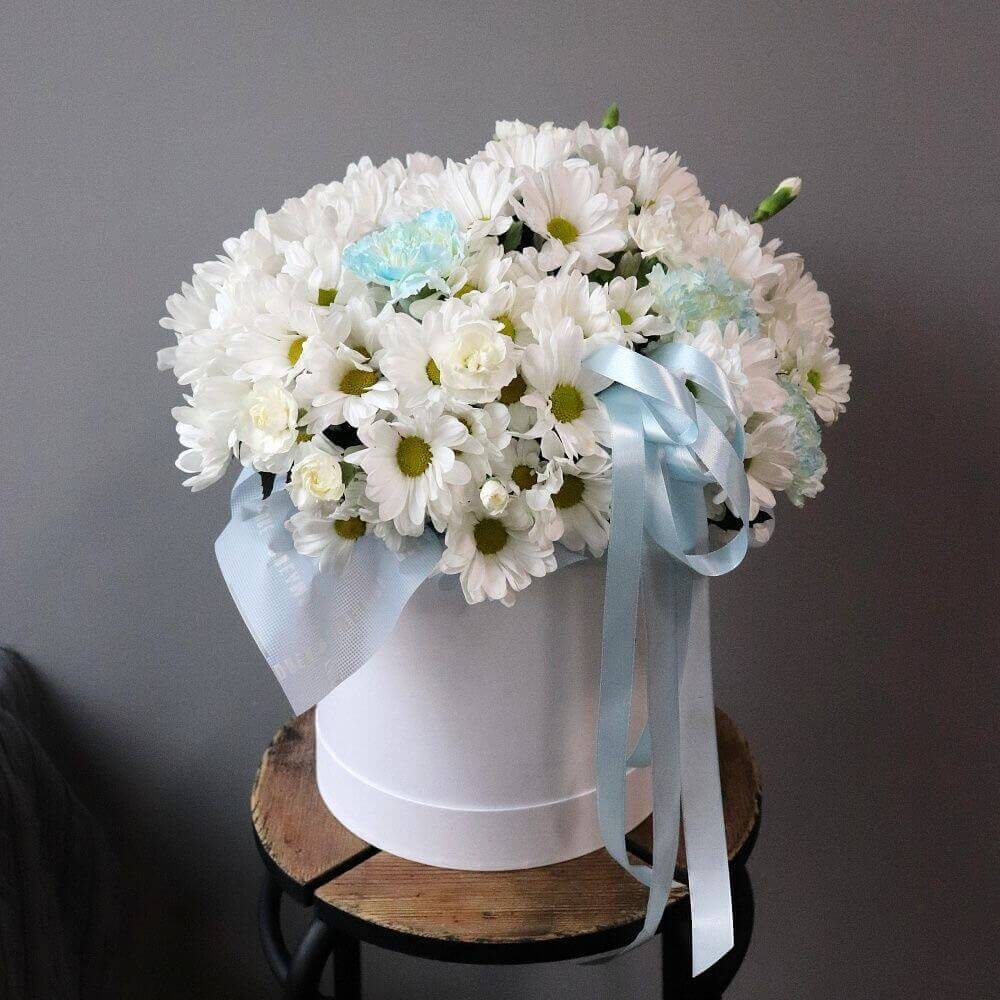 Коробка середнього розміру з білою ромашковидною хризантемою – це ніжність та свіжість у стильному оформленні. Білосніжні квіти нагадують польові ромашки, символізуючи чистоту, турботу й щирість почуттів. Такий подарунок виглядає по-особливому душевно та стане ідеальним вибором для дня народження, ювілею, подяки чи просто знаку уваги близькій людині.