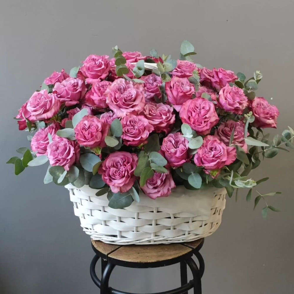 51 roses of the Country Blues variety in a basket are an elegant and unusual composition that impresses with its deep blue-purple shade and delicate shape of the buds. Each rose symbolizes nobility, mystery and elegance, making the bouquet the perfect gift for an anniversary, a romantic gesture or a special occasion.