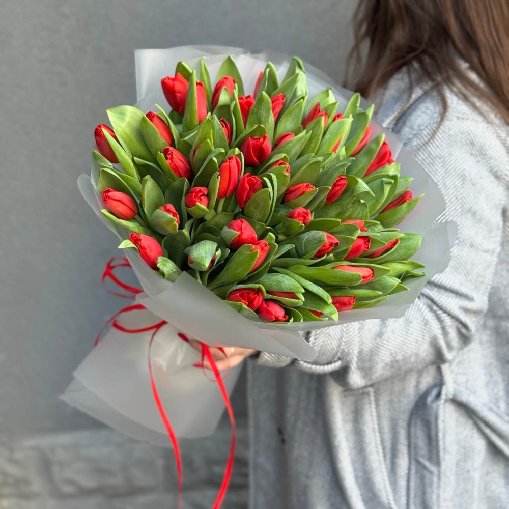If you want to buy tulips, a bouquet of 51 red tulips will be a great choice for an important event. Fresh flowers with strong stems and beautiful buds retain their freshness for a long time and give a spring mood.