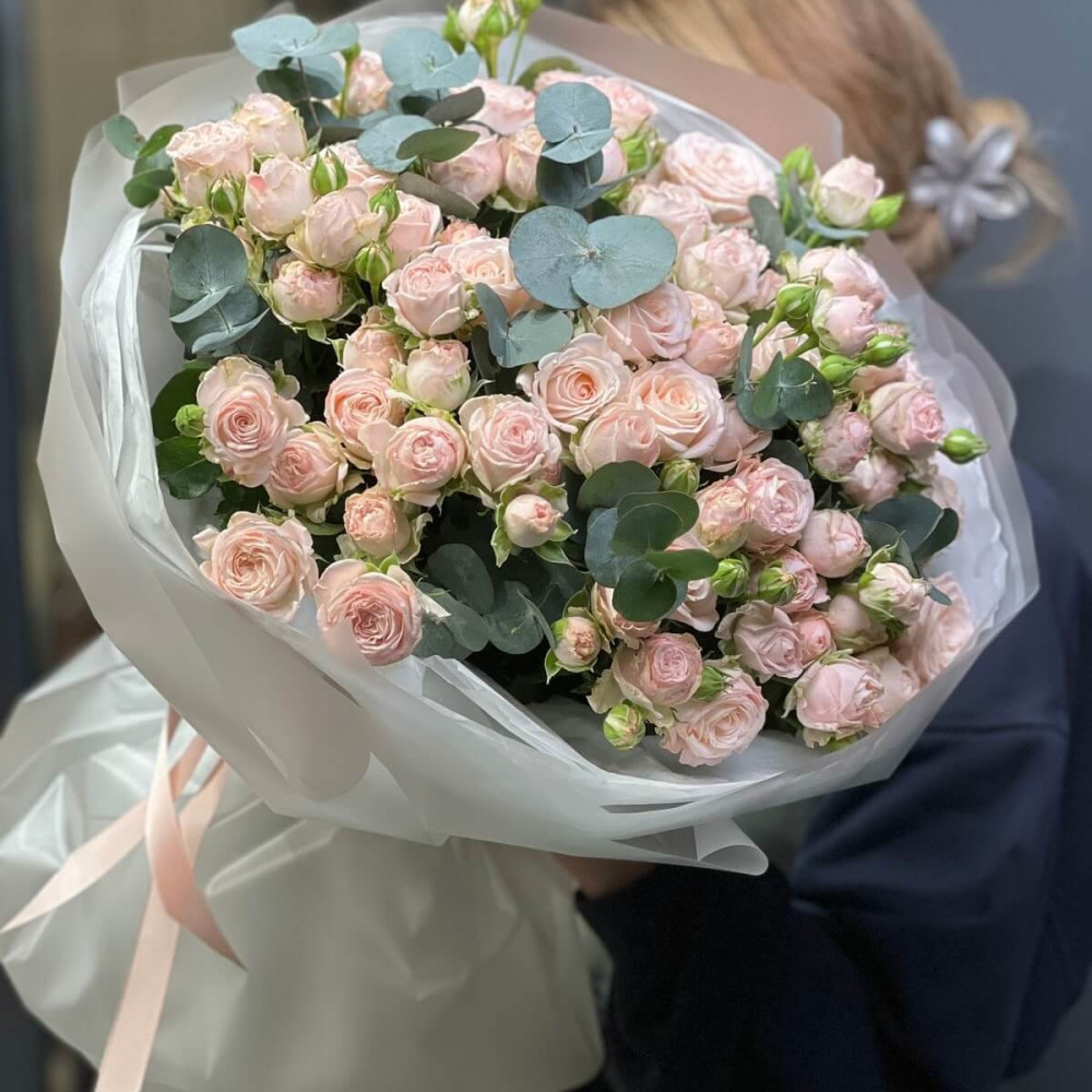 Букет із кущових троянд Мадам Бомбастік і евкаліпту – це витончена гармонія ніжності, свіжості та елегантності.