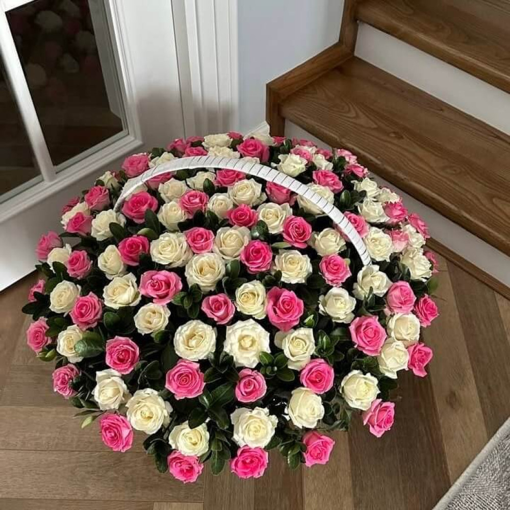 Купить корзину из 101 белой и розовой розы с бесплатной доставкой по Киеву. Заказывай розы и букеты на нашем сайте – нежный и роскошный подарок