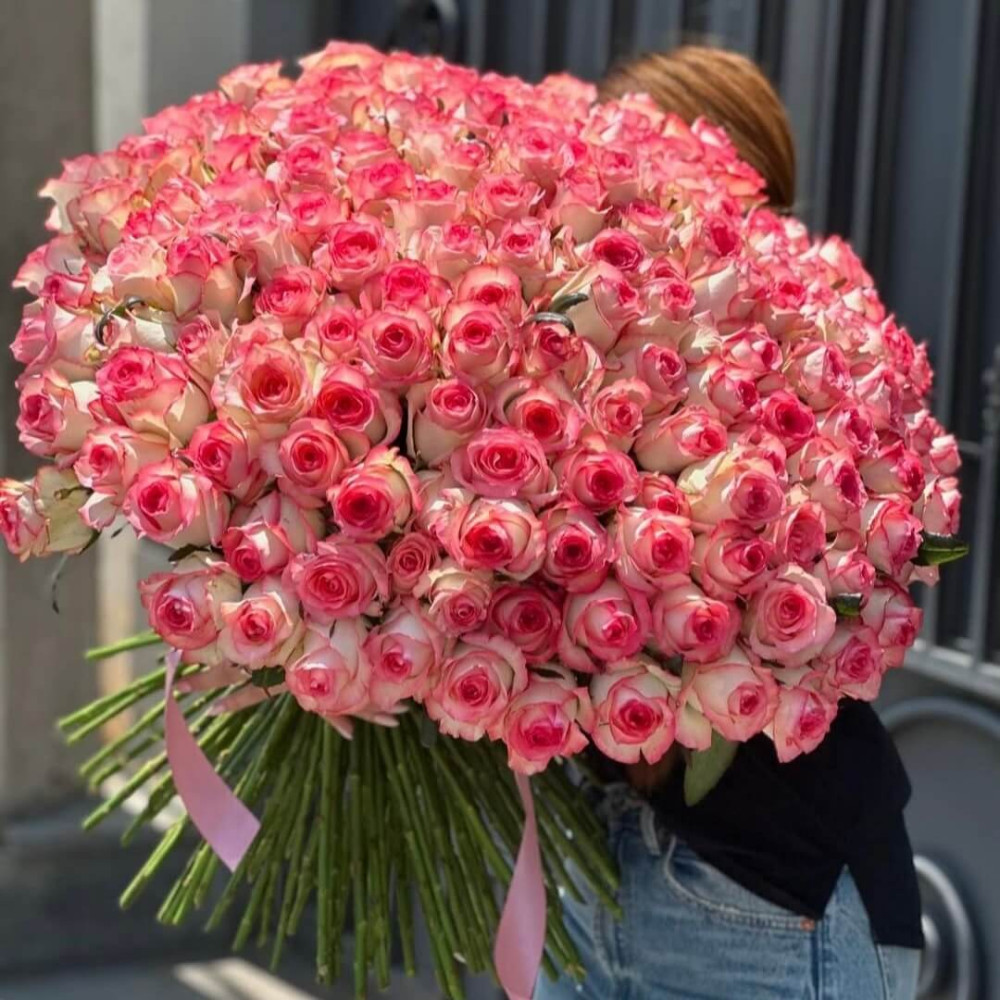 201 роза "Джумилия" - это по-настоящему роскошный букет премиум-класса, поражающий своей масштабностью и изяществом. Роза Jumilia известна нежными светлыми лепестками с контрастной розовой окантовкой, придающей букету элегантный и благородный вид.